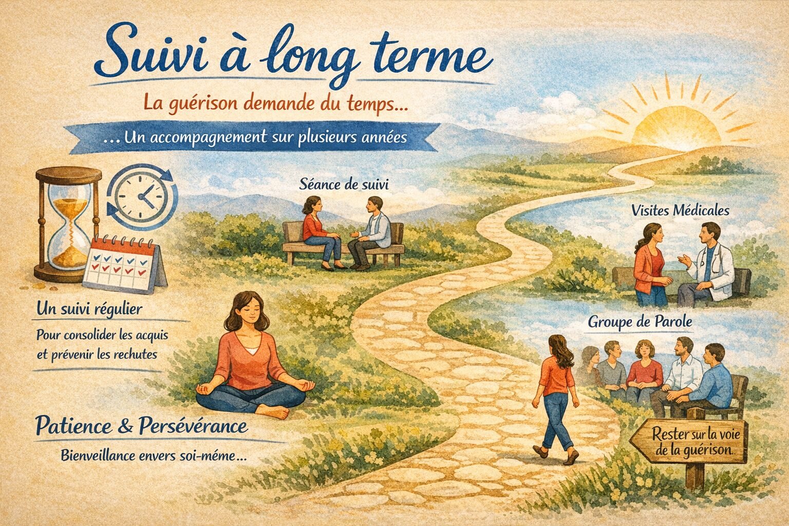 La guérison demande du temps, souvent plusieurs années. Un suivi régulier est indispensable pour consolider les acquis et prévenir les rechutes, fréquentes dans les TCA. La patience, la bienveillance envers soi-même et la persévérance sont essentielles.